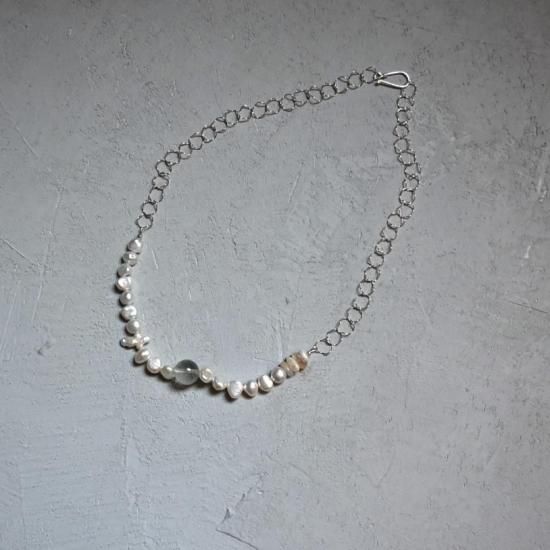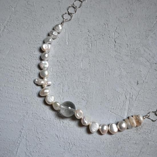 不揃いな淡水パールとクロス型の変形淡水パール、天然石が混ざり合い独特な表情に。