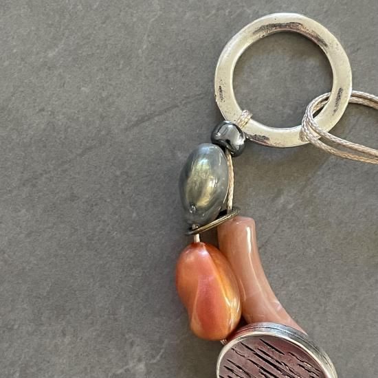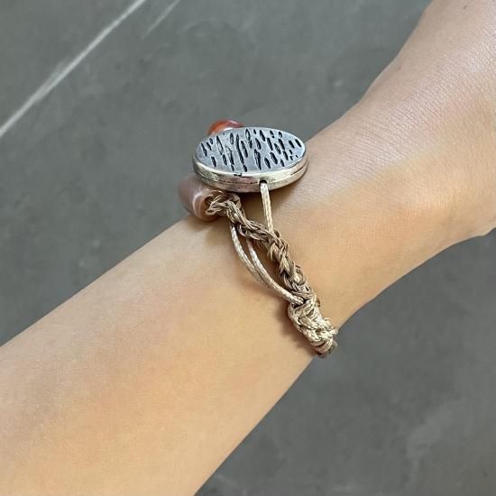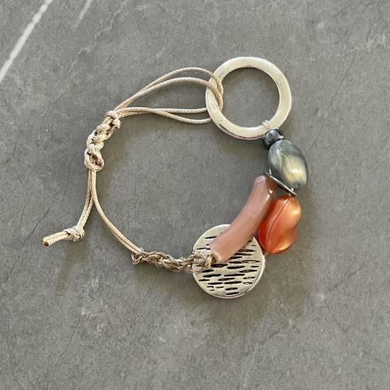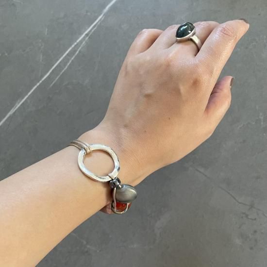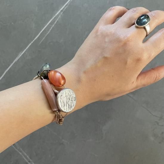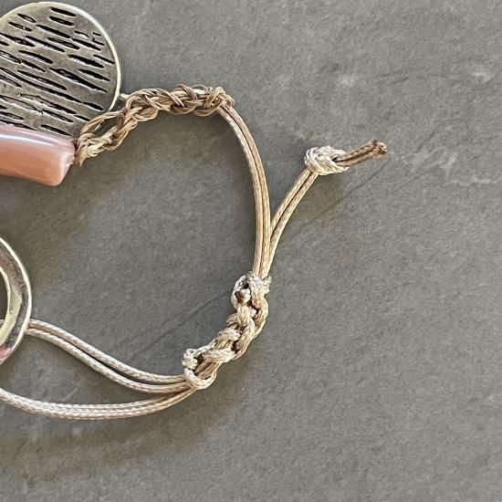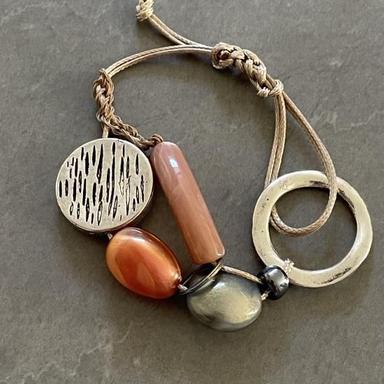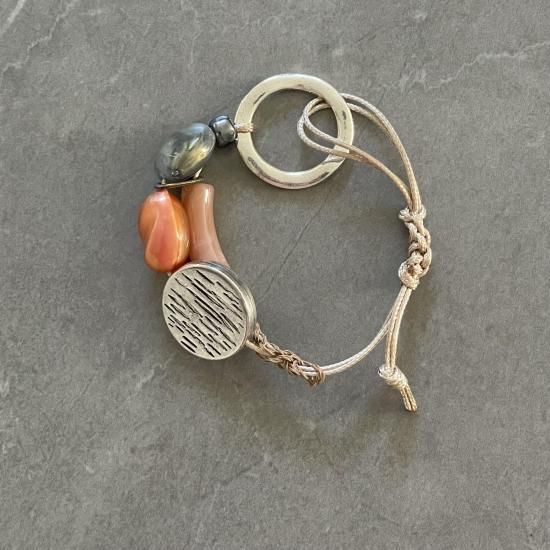 様々なパーツをミックスしたブレスレット。サイズ調整でき、見せる部分で印象が変わるブレスレットです。